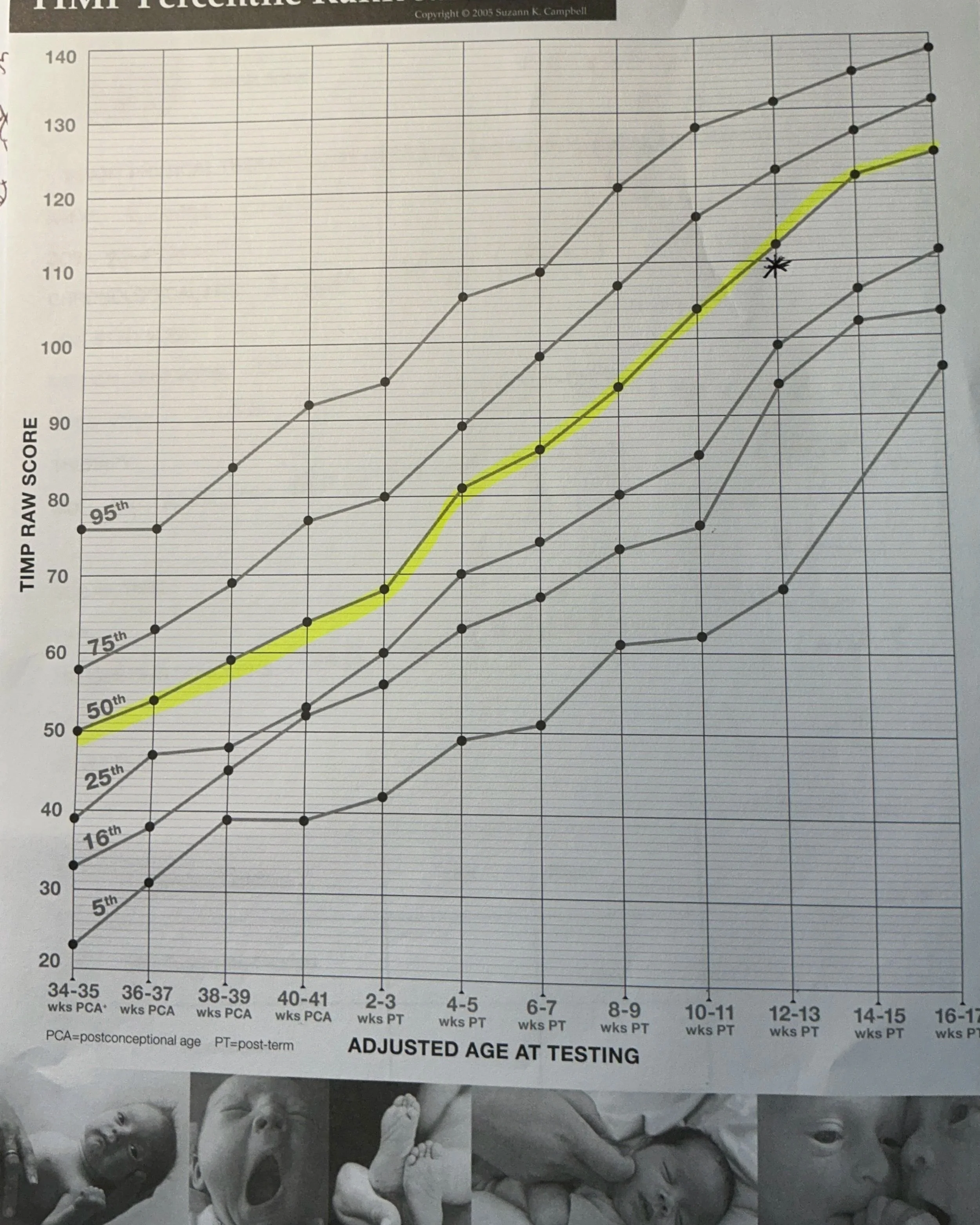 The Test of Infant Motor Performance. This is a standardized assessment of motor function in infants 34 week post conception age to 4 months adjusted age. It evaluates both observed and elicited movements of the infant in anti-gravity and gravity challenging positions to see how their nervous system responds. The score is plotted on a percentile curve.